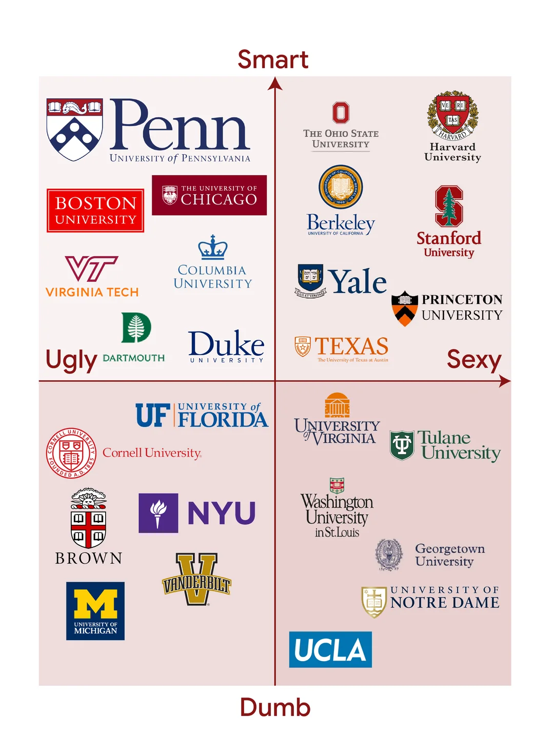 把宾大放在这一象限,很难让人不怀疑是竞争对手哈佛做的图。不过哈佛和宾大在明面上并不存在那么激烈的竞争关系(至少不像UMich和OSU这么大仇),毕竟两所顶尖藤校走的路线还不太一样。哈佛的综合名气更胜一筹,而宾大在商业领域有更明显的优势,职业导向更强。