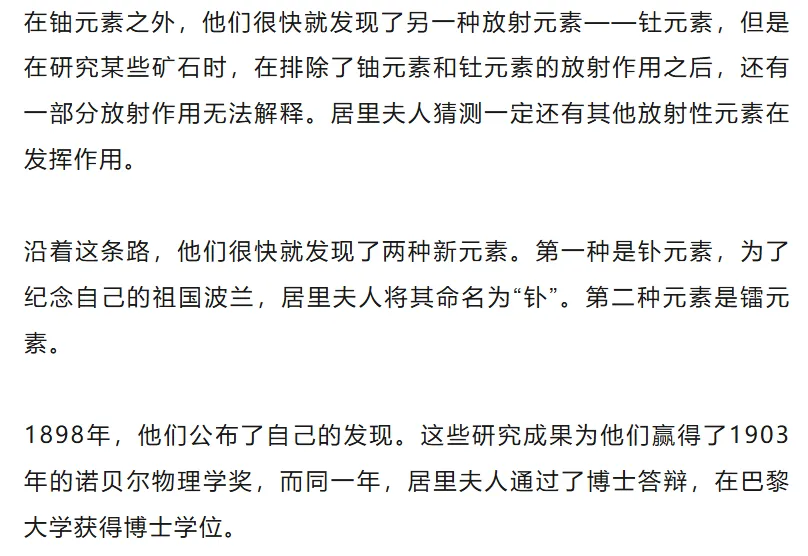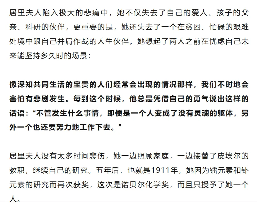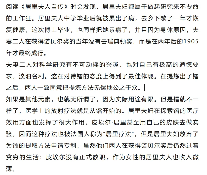 如果皮埃尔·居里没有英年早逝,那么这次应该还是他们两人一同获奖吧?毕竟,发现钋和镭这两种新的化学元素的很多工作,是他们两人一起完成的。