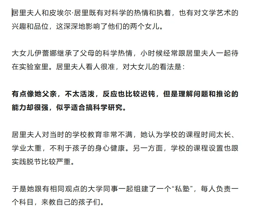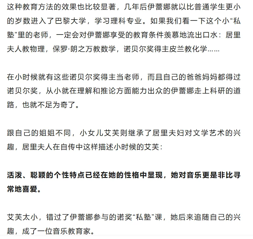 居里夫人的小女儿艾芙·居里(Ève Curie)是家里6人中唯一没有获得诺奖的人,她没有像姐姐一样追随父母在物理/化学方面的热情,而是继承了他们在文学艺术方面的兴趣,成了传记作家和记者。