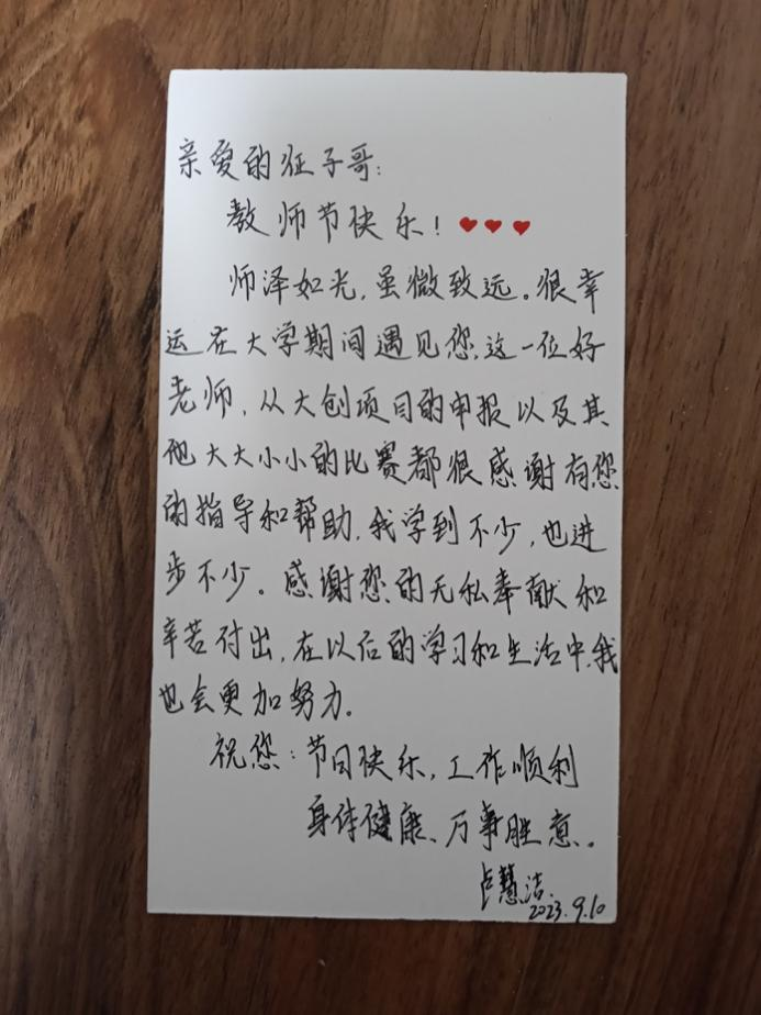 学生王心珂记得,大一开班会时,刘征会像兄长一样嘱咐学生直面大学生活的琐碎。她与刘老师熟悉起来是在考研前夕。一天中午在食堂偶遇,刘征端着饭碗很自然地跟她们坐在一起,一边吃饭一边聊职业规划。从选修课如何选,到考研方向、备考策略,再到就业建议,都掰开了、揉碎了讲给她们听。