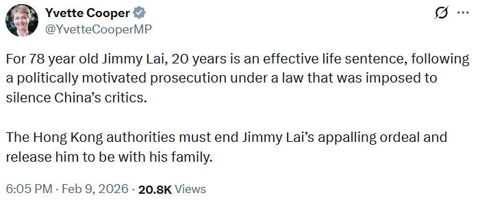 随着香港《苹果日报》创始人黎智英被判处20年监禁,英国政府做出强烈外交回应。英国外交大臣伊薇特·库珀(Yvette Cooper)通过社交媒体平台X发表声明,敦促香港当局停止这种“可怕的折磨”,并基于人道主义理由释放这名拥有英国公民身份的78岁老人。库珀指出,黎智英只是在行使言论自由权,而北京强加给香港的《国安法》旨在令批评者噤声。