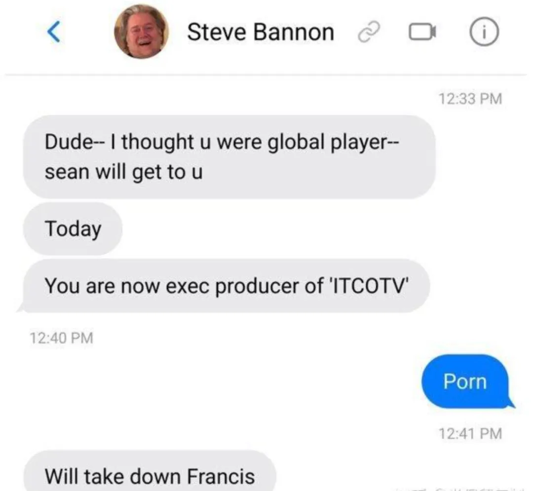 在一则信息中,班农明确写下“Will take down Francis”(我们会搞垮方济各),结合讨论的梵蒂冈语境,普遍认为所指为时任教宗方济各。班农还提及一本代号为“Itcvt”或“ITCOTV”的书籍,即法国学者Frédéric Martel所著、探讨梵蒂冈内部权力与性取向议题的《在梵蒂冈的秘柜中》。爱泼斯坦对此仅回复“Porn”(色情),随后班农再次重复了“搞垮方济各”的表述。
