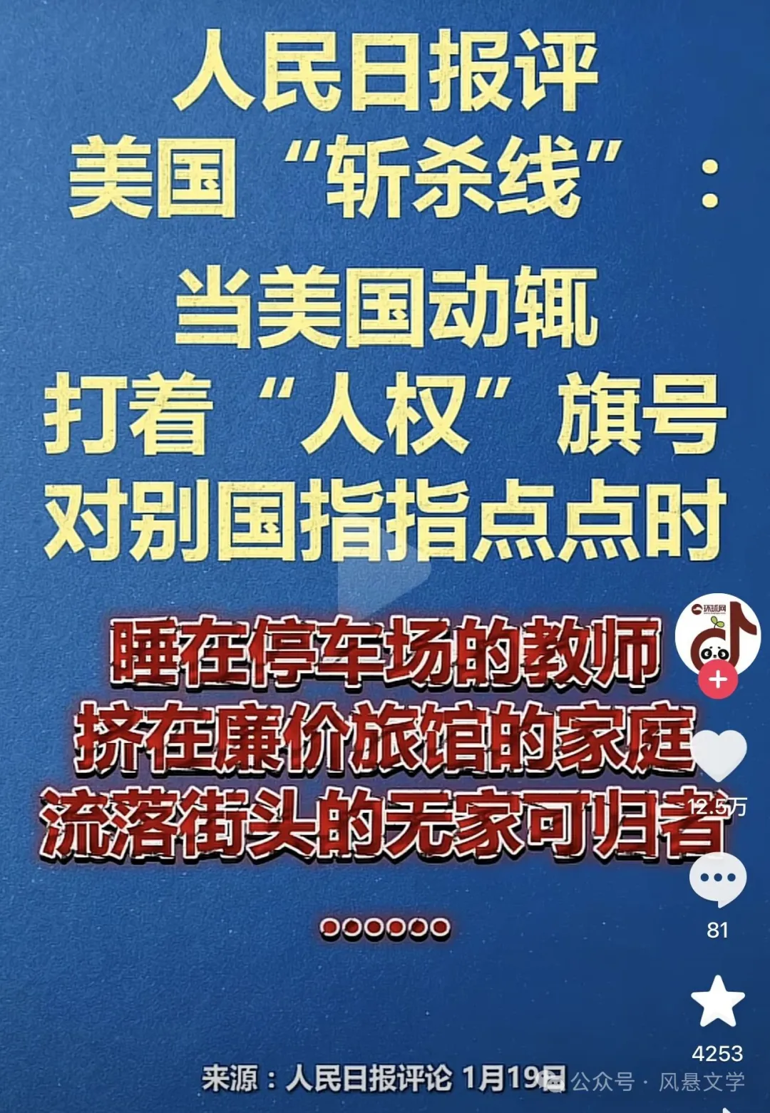 牢A是近景拍摄视频,讲的是具体的人、具体的事、具体的麻烦。一个像写评论,一个像拍纪录片,但在流量和标签面前,这些差别经常被一键压缩,他们都在讲美国,而且是讲美国的问题,所以大V们会把他两联系在一起。