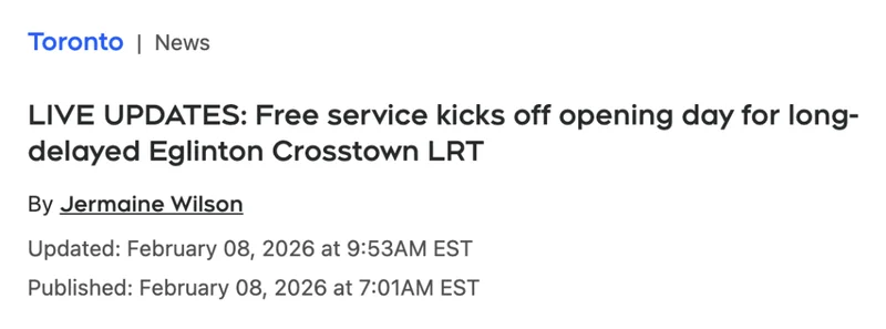 据多方加媒今日综合报道,延宕10+年,多伦多跨城轻轨——艾灵顿轻轨(Eglinton Crosstown LRT)今日正式投入运营。