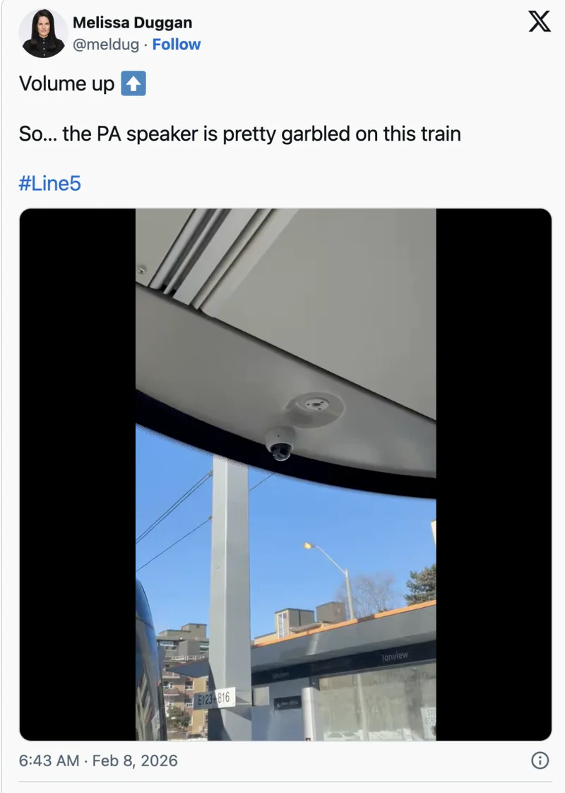 CP24 记者 Melissa Duggan 指出,一列 5 号线列车上的公共广播系统声音失真,导致广播内容难以听清,不过目前看并非重大问题。
