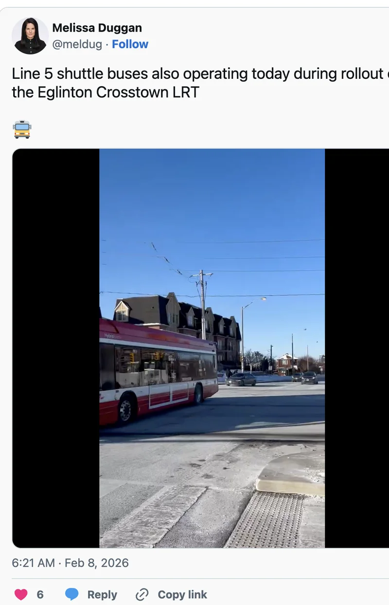 Duggan 表示,作为艾灵顿轻轨上线的一部分,5号线接驳巴士也在当天投入服务。