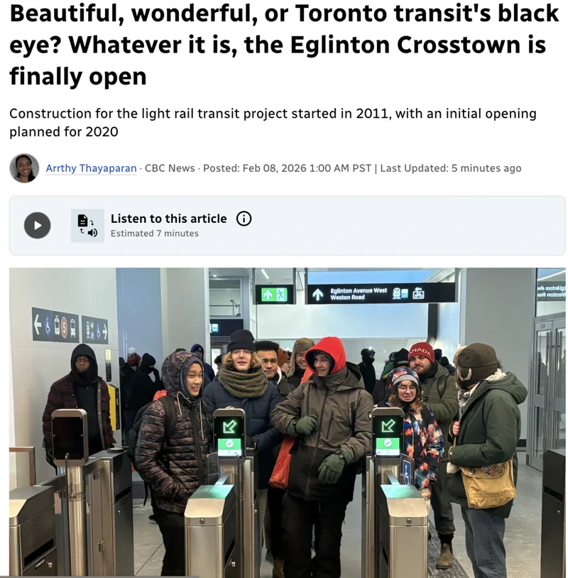 多伦多交通专家 Jonathan English 表示,艾灵顿线的开通体现了多伦多市民对公共交通的深厚情感,以及该项目本身的巨大规模。