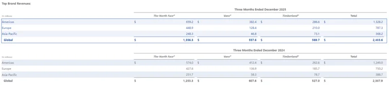 日前,北面母公司VF威富集团公布截至2025年12月27日的2026财年第三季度财报。数据显示,期内北面收入同比增长8%(按固定汇率增长5%)至13.56亿元,在销售旺季实现增长。