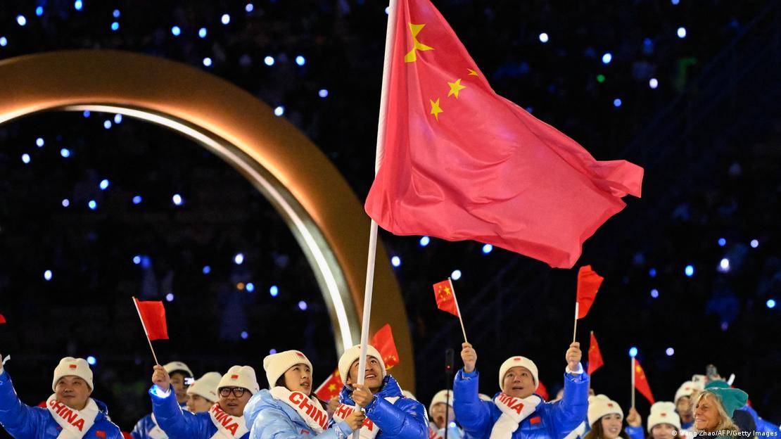 中国运动员挥舞国旗在开幕式上入场 图像来源: Wang Zhao/AFP/Getty Images