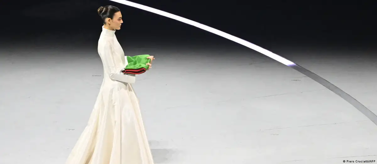 意大利超模维多利亚·切蕾蒂(Vittoria Ceretti)手捧意大利国旗,缓步走上米兰冬奥会的开幕舞台 图像来源: Piero Cruciatti/AFP