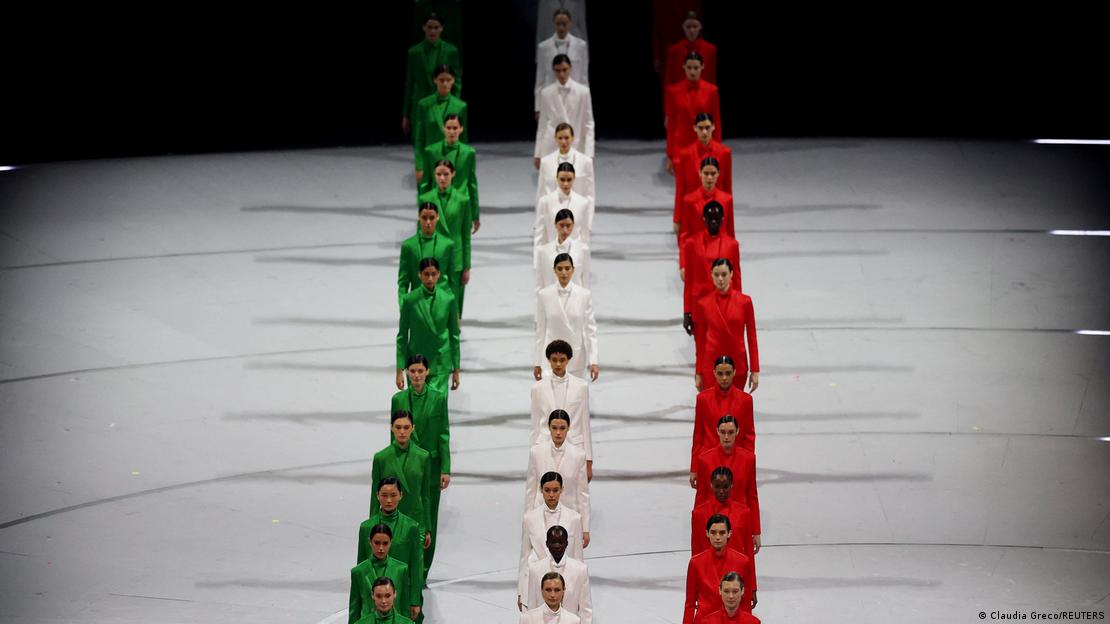 米兰-科尔蒂纳冬奥会开幕式上模特们身着意大利国旗颜色服装入场 图像来源: Claudia Greco/REUTERS