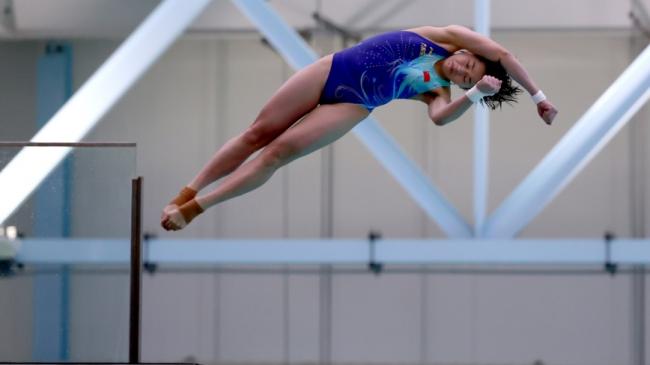 2025年4月12日,在加拿大举行的2025年世界跳水世界杯第二站比赛中,中国跳水运动员全红婵参加女子10米跳台决赛。(Gregory Shamus/Getty Images)