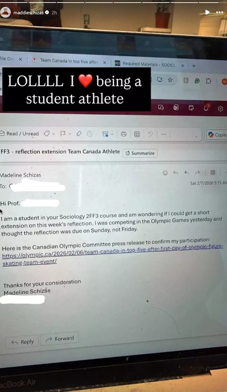 综合外媒报导,一名加拿大花式滑冰选手席萨斯(MadelineSchizas)日前在IG中发布一则限时动态,内容是她发给社会学教授的电子邮件,她在信中请求延长作业的期限,原因是她正在参加今年的冬季奥运,她表示,“我昨天参加了奥运会,以为作业是周日交,而不是周五”,为了证明参赛资格,席萨斯还附上加拿大奥委会的新闻连结。