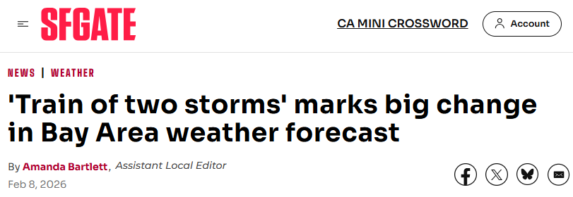 周日晚上之前,北湾地区就存在出现降雨的可能性,但更大范围的降雨预计要到周二(2月10日)早上才会影响该地区。由于西风带将来自阿拉斯加湾的冷空气输送至此,并伴随风暴系统到来,冷空气将逐渐主导天气形势。整个湾区大部分地区预计将出现至少四分之一英寸、最多可达二分之一英寸的降雨量;而塔马利帕斯山(Mount Tamalpais)以及圣克鲁斯山脉(Santa Cruz Mountains)沿海山坡等高海拔地区,降雨量可能超过一英寸。