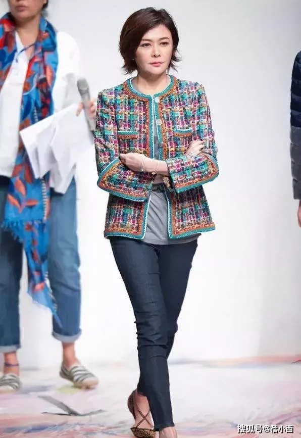 为了不抢走外套的风头,关之琳选择了灰色圆领 T恤作为内搭。低饱和度的底色起到了很好的中和作用,让整体造型在绚烂之余保持了呼吸感。下身搭配的深色牛仔裤更是点睛之笔,修身裤型拉长了腿部线条,牛仔面料的休闲感与粗花呢的奢华感形成巧妙碰撞。这种“上繁下简”的搭配思路,完美诠释了松弛感穿搭哲学。没有刻意堆砌大牌单品,也没有用力凹造型,却通过色彩与材质的平衡,让整体造型既华丽又日常,成熟女性也能轻松驾驭。