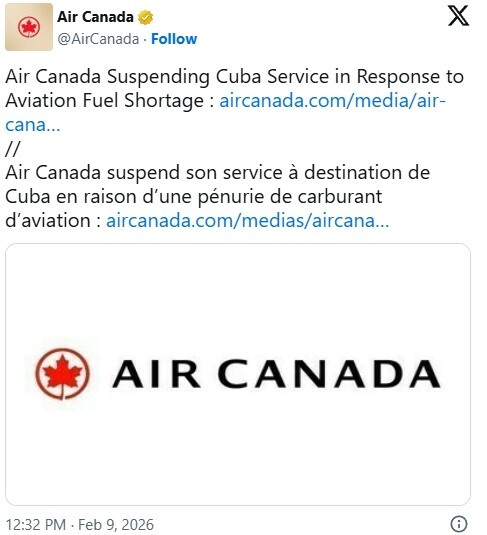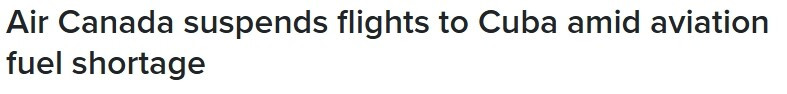 加拿大航空公司(Air Canada)表示,由于古巴出现航空燃油短缺问题,已决定暂停往返古巴的航班服务。
