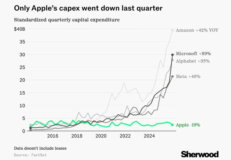不过相比这四大美国科技巨头在AI基建方面的加码投入,苹果公司则显得十分“特别”,其为最近一个季度美国科技大厂中唯一一家资本支出同比减少的公司。