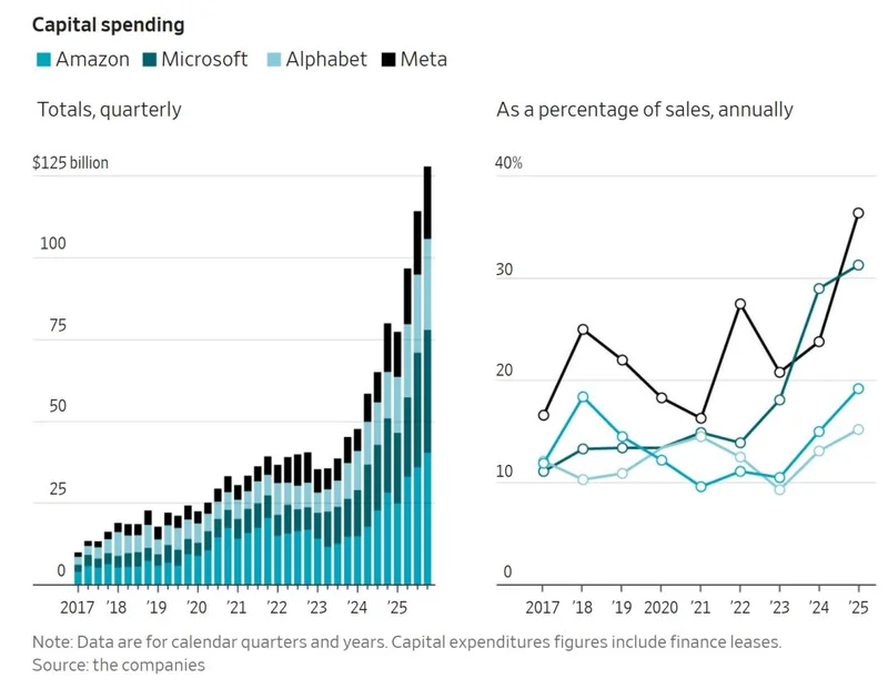 根据华尔街日报统计数据,从2023年年底到2025年年底,亚马逊、微软、谷歌、Meta四大科技巨头的资本支出呈现指数级暴涨态势。总支出占总销售额的比例也持续提高。据分析师预测,2026年Meta的支出可能会首次超过其销售额的50%。