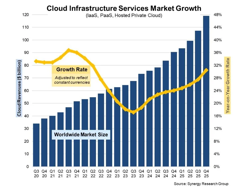 全球云基础设施服务市场增长情况,图源:Synergy Research