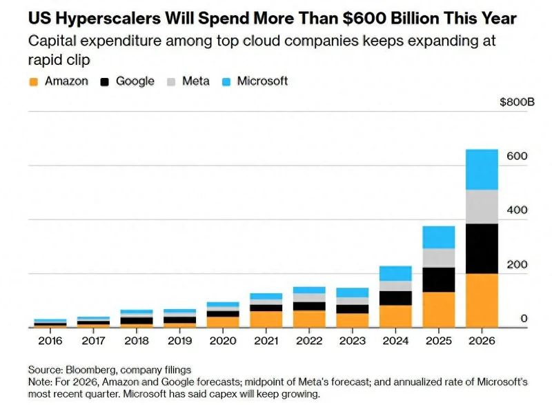 具体来看,2026年,Meta计划资本支出1350亿美元,谷歌为1750-1850亿美元,亚马逊为2000亿美元,微软没有给出明确支出预期,市场普遍预测其支出会超过华尔街预期的1140亿美元。