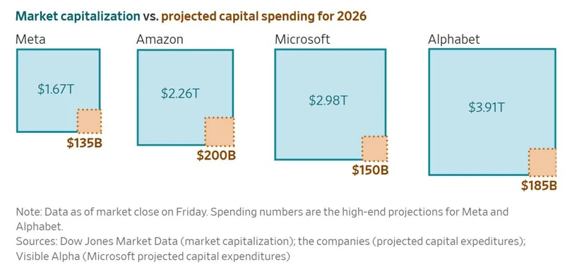 公司市值与资本支出对比,蓝色部分为公司总市值,黄色部分为2026年资本支出,Meta目前资本支出与总市值比例最高,图源:华尔街日报