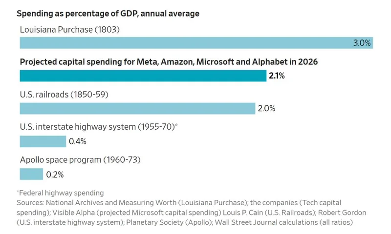 按照华尔街日报6700亿美元的预测数据,这一总支出占美国GDP的比例约为2.1%,仅次于美国1803年购买路易斯安那州(占GPD 3%)。相比之下,阿波罗登月计划占GDP的比例只有0.2%,登月在AI基建投资面前已经沦为“计量单位”。