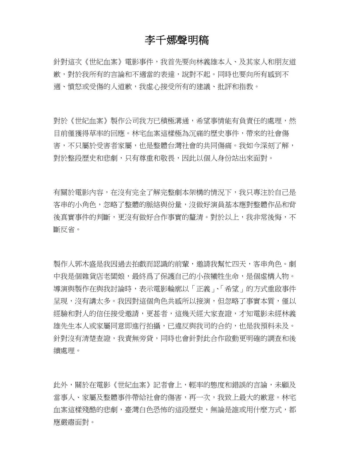 A:李千娜在杀青记者会上称林宅血案“可能不是那么严重、或者没那么恐怖”,引起舆论抨击。事后,李千娜发声明向林义雄及其家属致歉,坦承自己在记者会上“轻率的态度与错误的言论”未顾及社会伤痛,并称自己因只专注于自己客串的小角色,忽略了整体历史脉络的份量,没做好基本判断,“对于以上,我非常后悔,不断反省。”