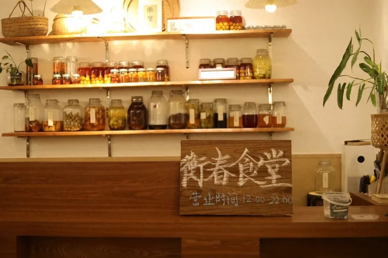 “好好吃饭”不只在于食物本身,也在于吃饭的环境。我的食堂布置得像一个客厅,进门后的水吧台附近有个长椅,旁边摆着一些书架和绿植。客人们傍晚来了会在那里稍坐,翻一翻画册、杂志,自己倒水喝,吃零食和水果。厨房是开放式的,想要添饭菜可以自己到厨房来盛。餐桌有卡座、四人桌,也有能坐得下八人的长桌,大家围坐在一起吃饭时会自然地聊天。小到分享最近新买的手机挂件,大到讨论近期的民生新闻。有好几个客人跟我说,在这里吃饭让他们有在家的感觉,也会忘记看手机。在吃饭间歇我听他们讨论一些社会事件背后的普遍规律,也觉得开拓了视野。