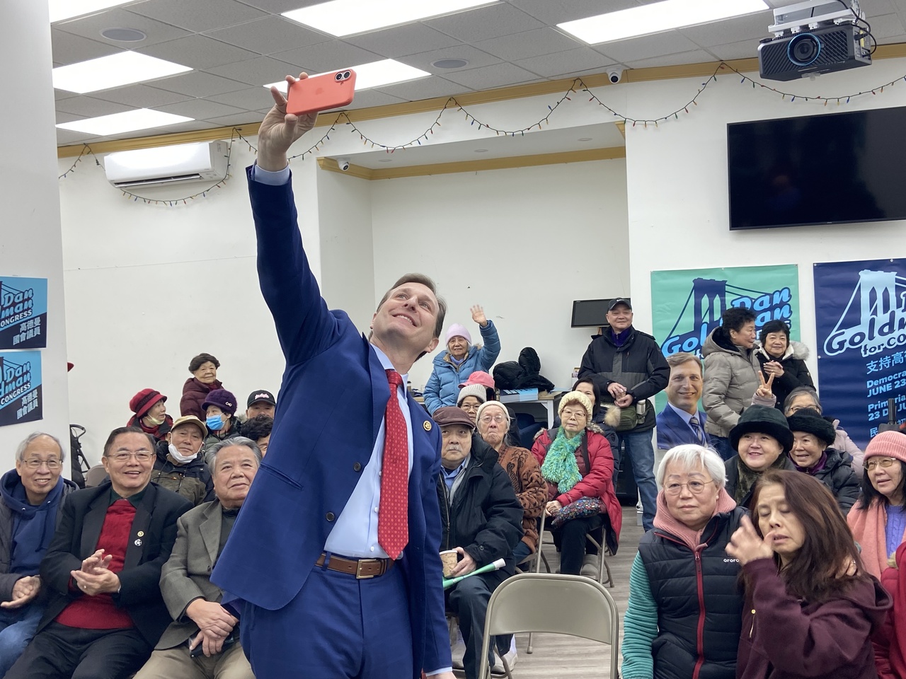 高德曼在华埠孔子大厦与选民自拍合影。(记者许君达╱摄影)