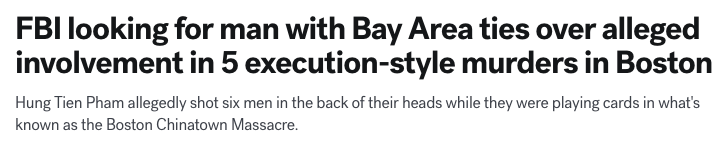 美国联邦调查局(FBI)表示,一名在旧金山湾区有家人的华裔男子,涉嫌参与35年前在波士顿唐人街发生的多起行刑式枪案。他曾近距离射击了6名男子,造成5人死亡,其中一名幸存者指认了枪手。然而,该名嫌疑人至今仍在逃。如今,官员们再次呼吁公众提供线索,以帮助将其绳之以法。