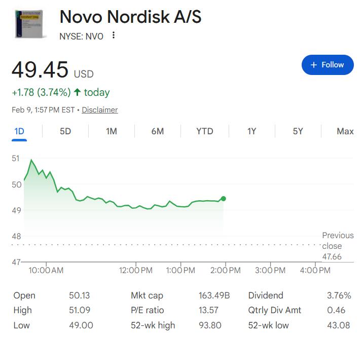 FDA信函公布后,丹麦上市的诺和诺德欧股刷新日低至309.35丹麦克朗,日内涨幅收窄到约4.7%,收涨不足5.3%,纽交所上市的诺和诺德美股也刷新日低,跌至49美元,日内涨幅从盘初刷新日高时的逾7.2%收窄到不足2.9%。