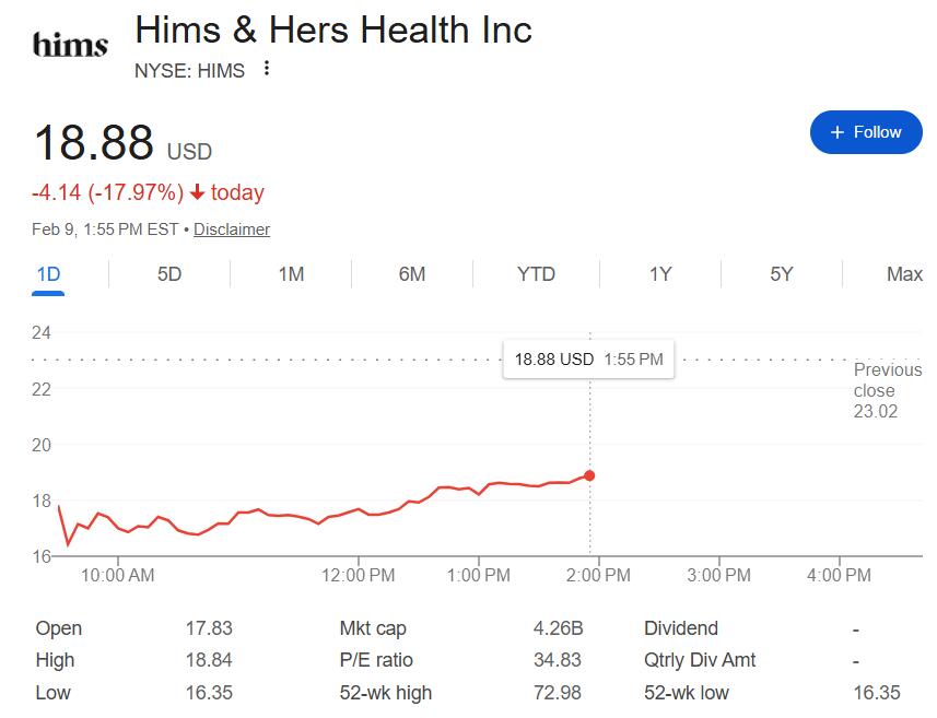 诉讼消息公布当天,Hims股价本周一盘初曾跌近29%,午盘跌幅收窄到20%以内。