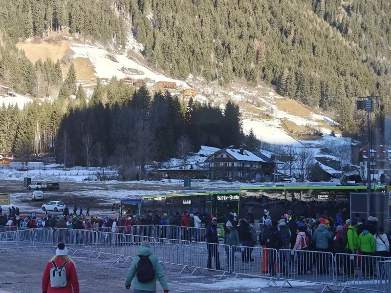 更深层的原因,在于地形本身的限制。安泰塞尔瓦冬季两项竞技场位于海拔1600米以上的山谷尽头,道路狭窄、承载能力有限。冬奥会期间,当地实施三层交通限制区管理,所有车辆须持通行证进入核心区域。绝大多数观众要先乘坐火车或公交到达指定换乘点,再排队搭乘接驳车上山。