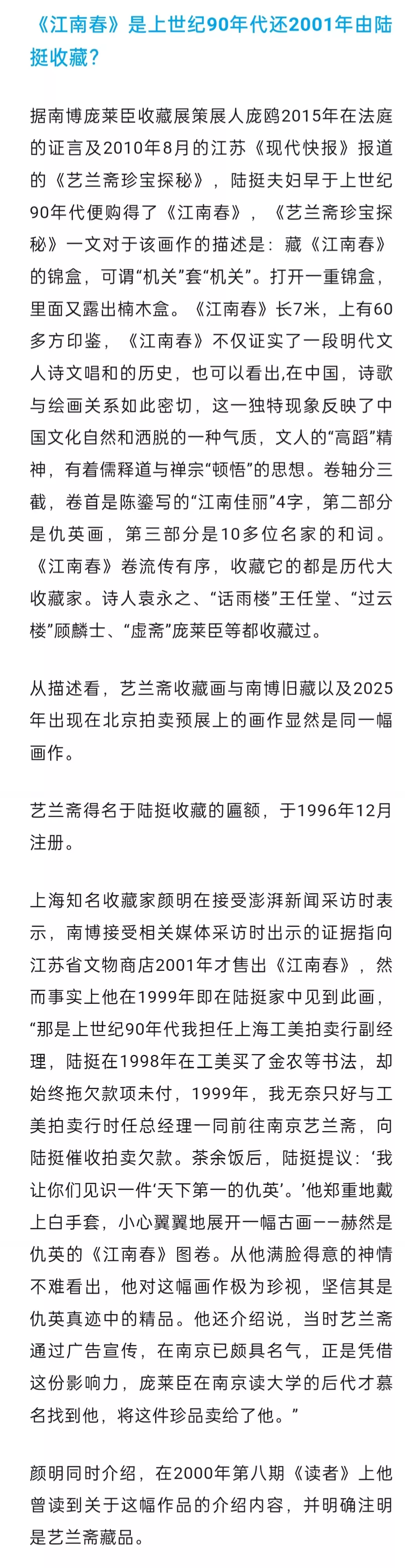 官方最新通报,也和之前“澎湃新闻”报道中的诸多信息对上了(比如,上海知名收藏家颜明说他在1999年即在陆挺家中见到此画,以及2010年8月的江苏《现代快报》报道陆挺夫妇早于上世纪90年代便购得了《江南春》)。