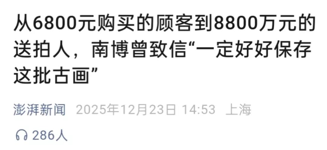 此前的新闻报道中说,南博2025年12月19日公开的资料显示,2001年4月16日,《江南春》就以6800元被“顾客”买走,销售清单为《仿仇英山水卷》。