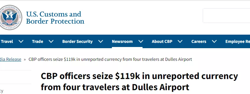 美国当地电视台7News在获准进入杜勒斯机场拍摄海关实际执法过程中曾拍到,执法人员在现场检查中发现一个家庭携带超过2.2万美元现金没有提前申报。