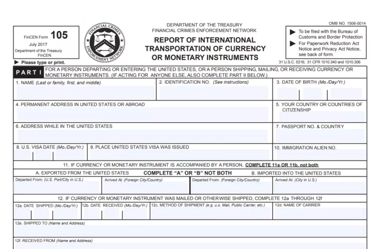 事实上,美国法律并未限制旅客携带现金的金额上限。无论是1万美元、10万美元甚至更多,都可以合法携带进出美国。但法律明确规定,只要携带的现金或货币工具总额超过1万美元,就必须向美国财政部提交国际货币或货币工具运输报告,也就是FinCEN 105表格。