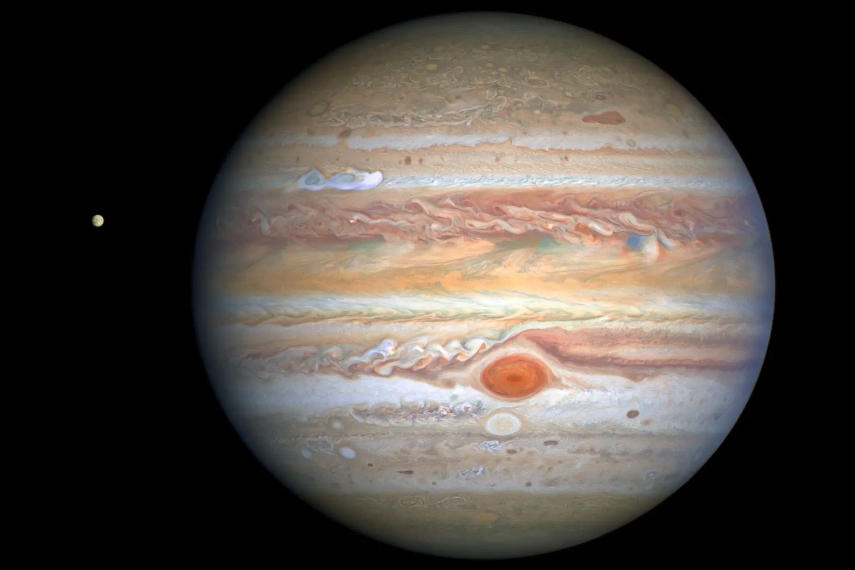 有研究发现,木星比人们先前估算的更小、更扁平。图为木星与它的卫星欧罗巴(Europa,又称木卫二,在图片的左方)。(NASA)