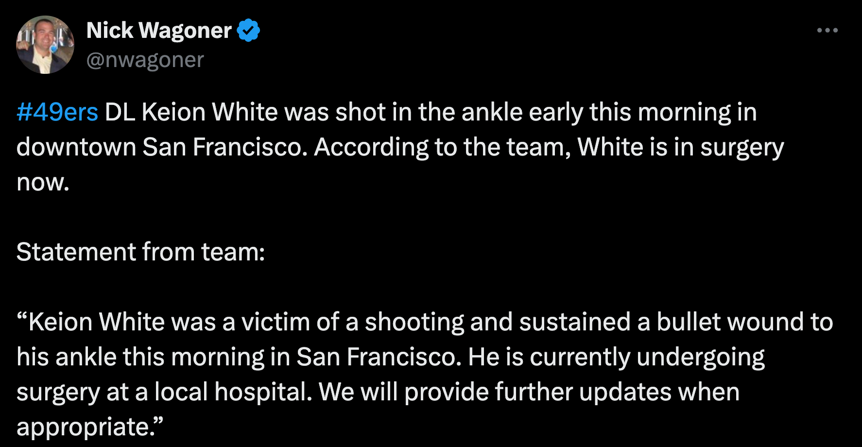 49人队在周一下午发布的声明中表示:“Keion White是此次枪击事件的受害者,今天早上在旧金山,他的脚踝中枪。目前他正在当地一家医院接受手术。我们会在适当的时候提供进一步的消息。”