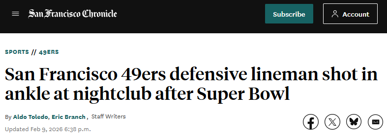 据报道,据球队方面以及一位了解此事的知情人士透露,在圣克拉拉举行的超级碗比赛结束后,旧金山49人队的防守前锋Keion White于周一清晨在一家夜店遭枪击,脚踝受伤,目前正在康复中。