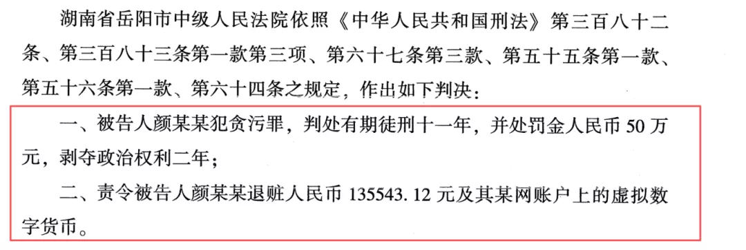 2019年5月底,颜某调离专案组后,5月至10月期间,颜某利用掌握的账户和密钥,将张某、廖某的虚拟数字货币账户中价值人民币2098万元的虚拟货币转到自己账户,先后变现金额338800.12元。