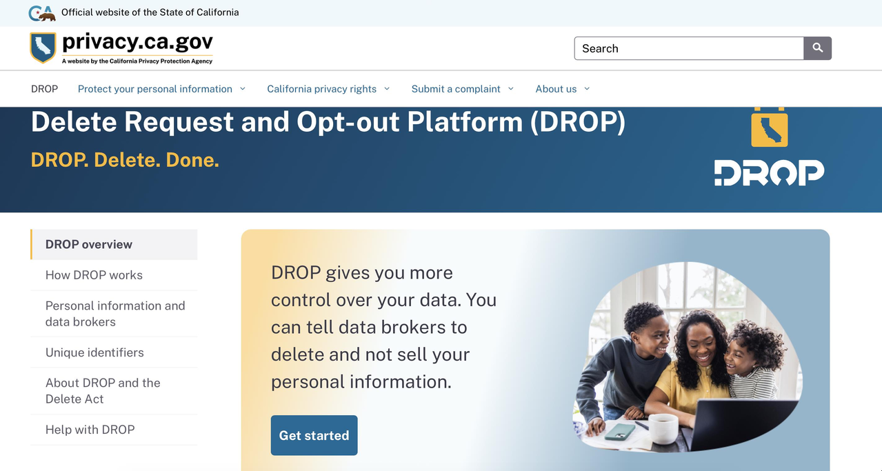 加州隐私保护局推出「删除申请与选择退出平台」(DROP),提供居民申请删除个人资料的线上管道,让使用者可透过单一平台拒绝数据仲介公司贩售个资。(截至DROP官网首页)