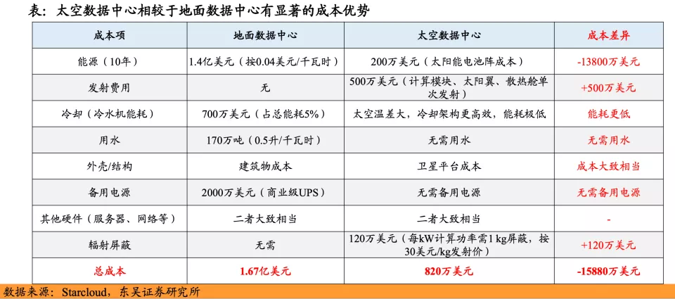 而据东吴证券的测算,太空数据中心的全生命周期成本显著低于地面设施,以40 MW 集群运行10年为例,地面方案的总运营成本约为1.67亿美元,而采用太空算力仅需约820万美元,10年可节省约1.59亿美元。