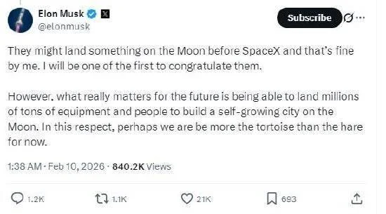 马斯克补充称:“然而,对于未来而言,真正重要的是要能够将数百万吨的设备和人员送上月球,并建立一个能够自我发展的城市。在这方面,或许我们现在更像是那只乌龟,而非那只兔子。”