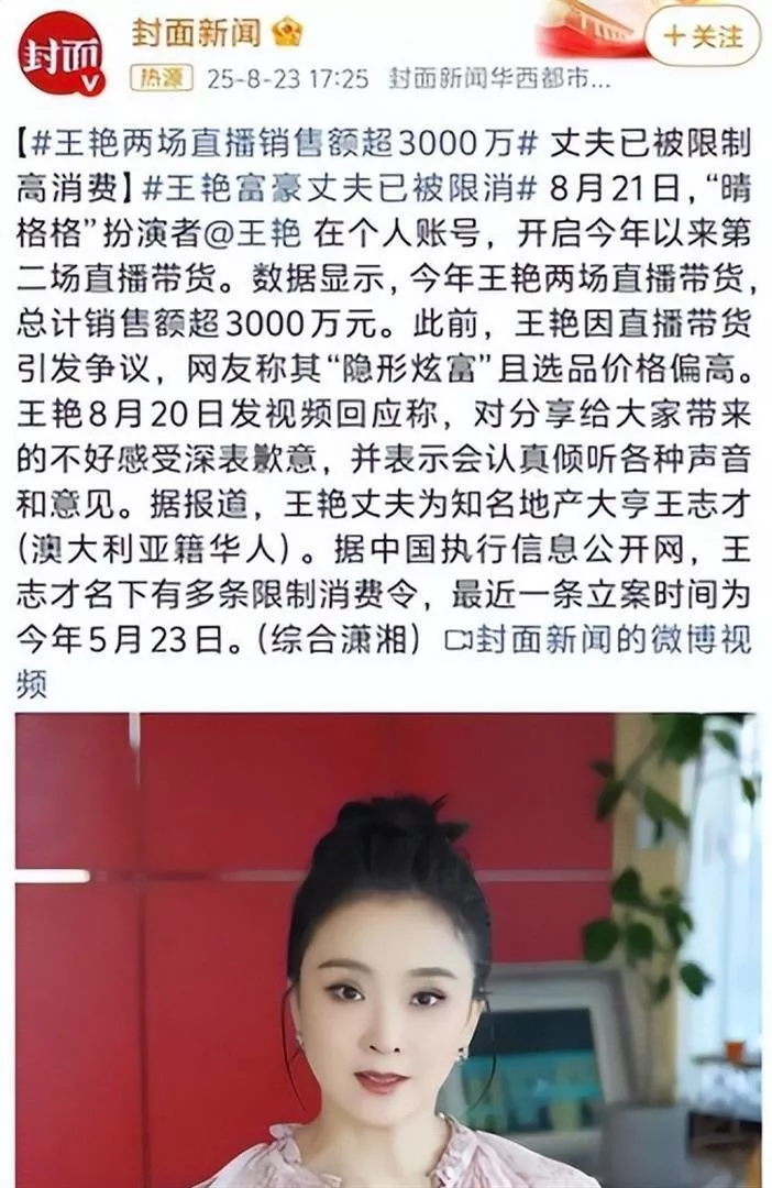 争议在2025年达到巅峰。 她带货一款英国益生菌,三场直播销售额破2750万,却因产品高价被骂“割韭菜”。8月20日她发视频道歉:“没想到直播让大家这么难受。 ”但网友发现,她住的仍是故宫旁豪宅,丈夫公司已被列为被执行人。这种撕裂感让她被质疑“卖惨博同情”。