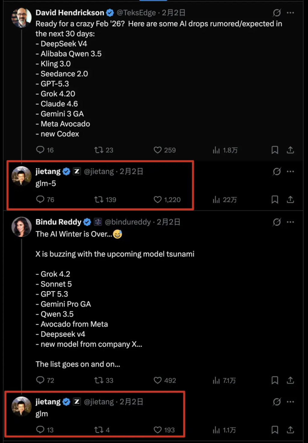 智谱GLM-5的潜在发布时间点,正值国产大模型密集的“春节档”发布期。智谱AI首席科学家唐杰此前在内部信中预告GLM-5即将发布,时间窗口指向2026年2月中旬。与此同时,DeepSeek新模型、MiniMax计划发布的M2.2以及Qwen 3.5均有消息传出将在近期更新。