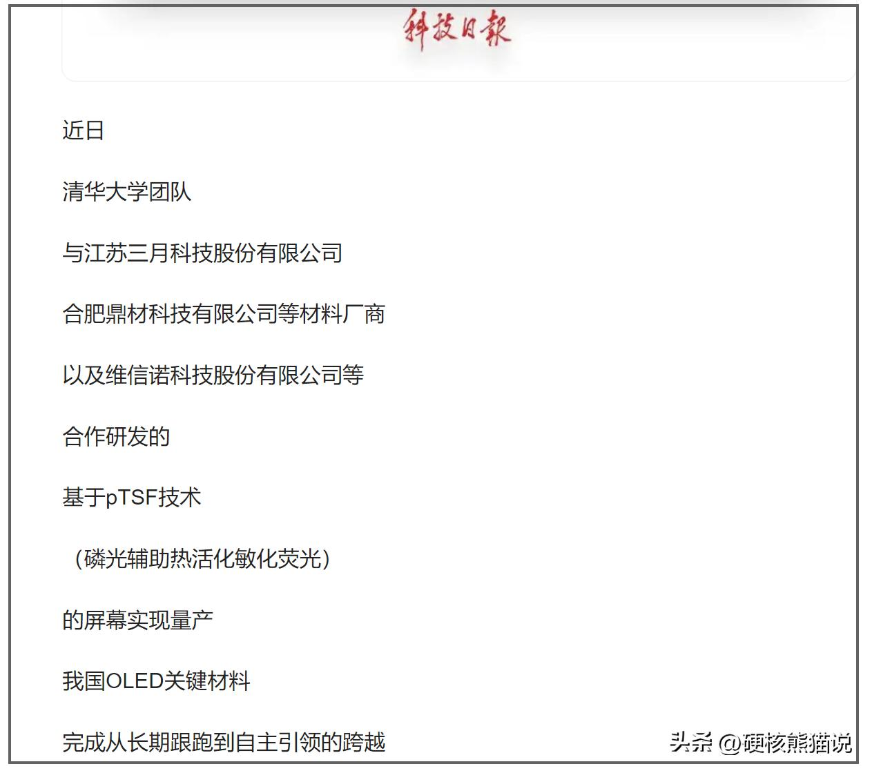 近日,中国基于pTSF技术(磷光辅助热活化敏化荧光)的OLED屏幕实现量产,而且更是用在了我们的高端手机上,这下中国在OLED 材料技术上实现了领跑,全球OLED市场要重新洗牌了,三星地位不保。