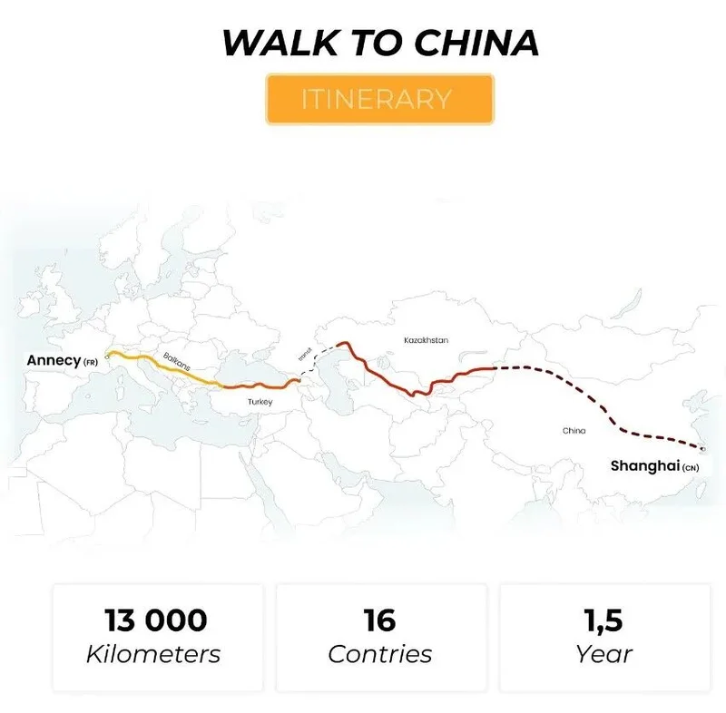 2024年的一个深夜,这对打小就在一起上学、认识超过十年的老友坐在一起闲聊。聊起旅行,他们发现一件特别浪漫的事情:“从法国出发,中国是向东徒步所能到达的最远地点之一;它象征着世界的尽头” 。