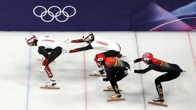 2026年2月10日,进入米兰-科尔蒂纳冬奥会第四天,短道速滑混合团体接力赛四分之一决赛中,加拿大队的威廉・丹吉努和费利克斯‧鲁塞尔与中国队的林孝埈和孙龙在米兰滑冰场展开角逐。(Jared C. Tilton/Getty Images)