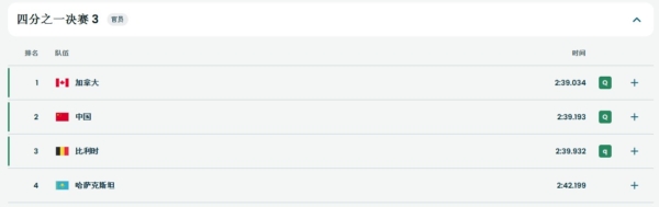 中国队微调阵容,由公俐(女)、王欣然(女)、刘少昂(男)和孙龙(男)出战。尽管一度落后,但凭借孙龙的连续超越以及荷兰队的意外摔倒,中国队以2分38秒375的成绩获得小组第二,成功锁定A组决赛席位。